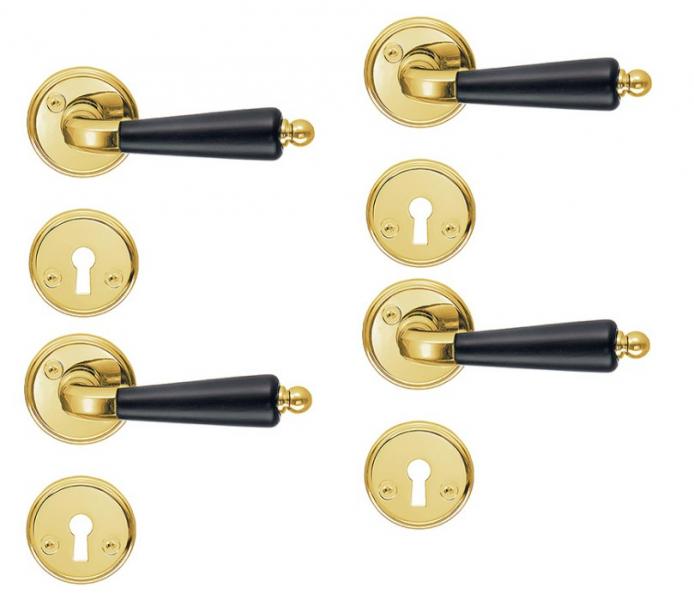 Beslagsboden indendørs dørgreb inkl nøgleskilt - Poleret messing/sort - Sæt á 4 stk OBS: Varen er på lager - både til afhentning og dag-til-dag levering.