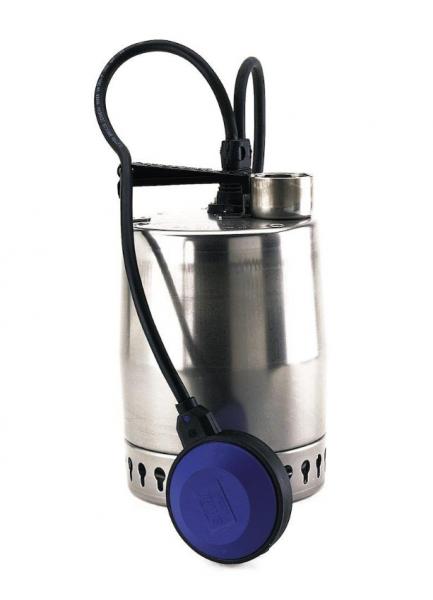 Grundfos UNILIFT KP dykpumpe 150 A-1 Grundfos Unilift KP 150 A 1 kælder- og lænsepumpe er en vertikal ettrins-dykpumpe af rustfrit stål med vertikal afgangsstuds. Pumpen har indløbssi og løftebøjle og leveres med et 5 m netkabel og svømmerafbryder for automatisk start/stop. Løberen er en halvåben løber med frit gennemløb på 10 mm egnet til pumpning af grundvand, overfladevand, regnvand og lignende medier. Pumpen har dobbelt akseltætning bestående af to læberingstætninger med fedt imellem. Den ydre kappe på pumpen sikrer konstant køling af motoren ved hjælp af pumpemediet. Rotorakslen kører i to vedligeholdelsesfrie kullejer, som køles af pumpemediet. Motoren er fyldt med en ugiftig væske. Medie: