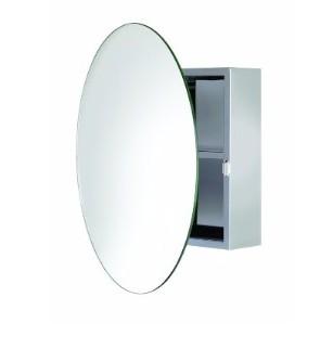 Skab med rund spejllåge. Diskret opbevaring til små badeværelser. Skab og intern hylde i rustfrit stål,  kommer samlet, inkl. alt til montering.  |