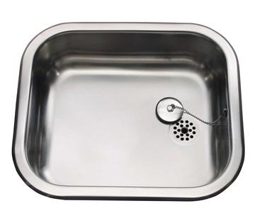 Køkkenvask, enkeltvask, i rustfrit stål børstet finish til nedfældning, med prop/kæde.  |