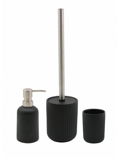 Produkterne er lavet af keramik og har en flot mat sort. På trods af sættes enkelthed og simple design, så giver den riflede overflade et særegent udtryk, der pynter på badeværelset.