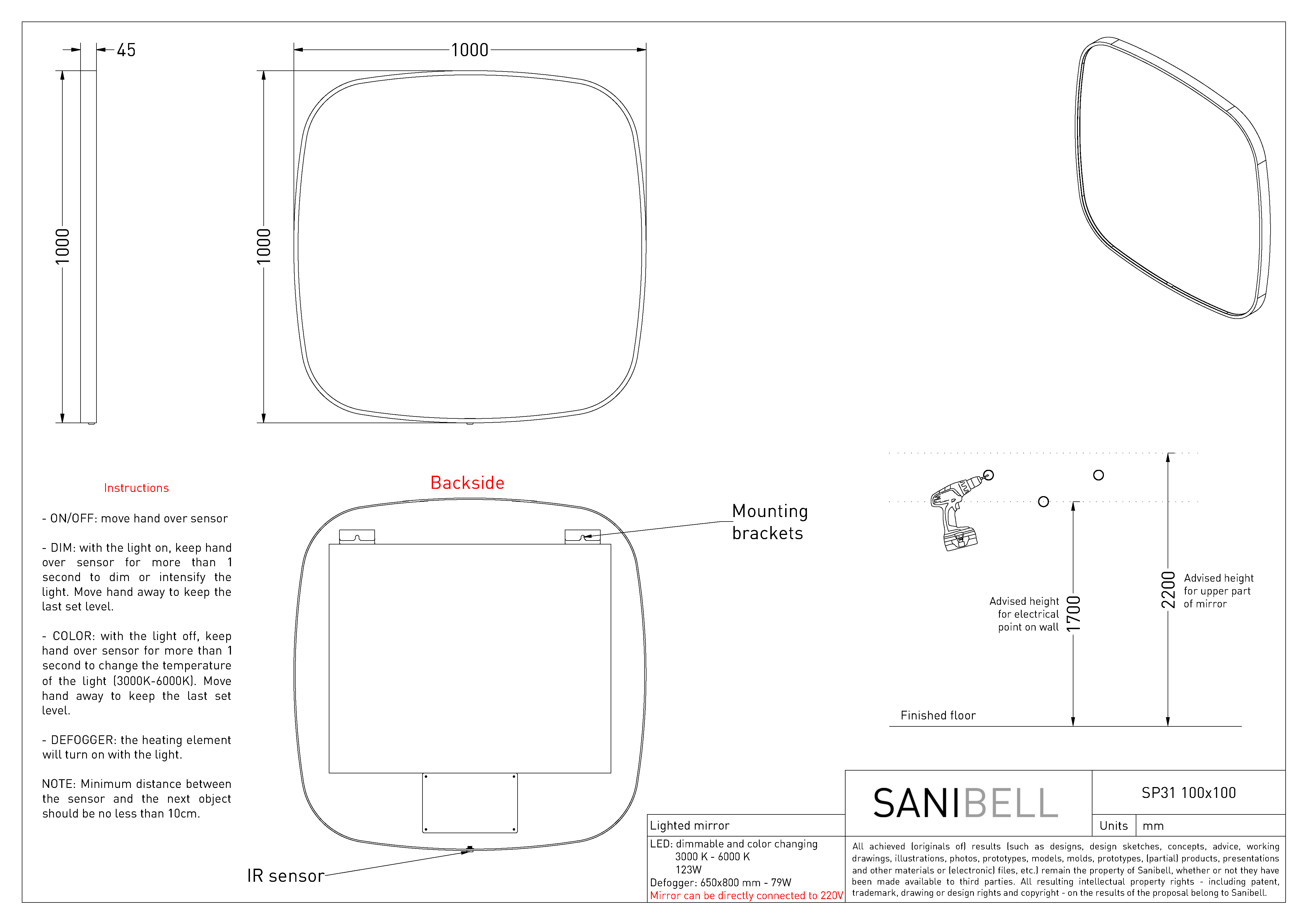 Sanibell Ink SP31 spejl m/lys, varme og sensor 100 x 100 cm - Gunmetal