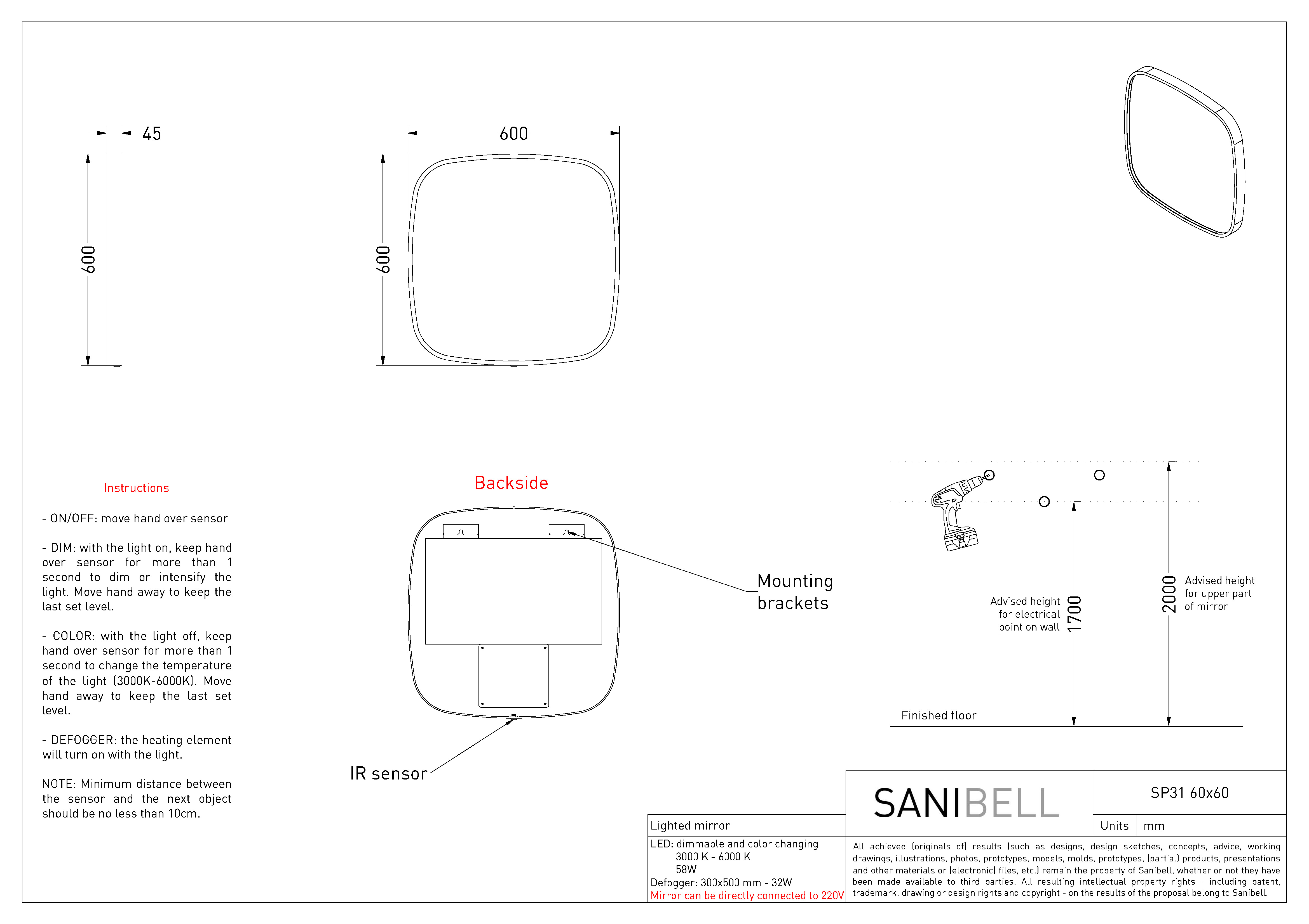 Sanibell Ink SP31 spejl m/lys, varme og sensor 60 x 60 cm - Gunmetal Superellipse-formet spejl fra Sanibell Ink med indbygget lys i rammen. Det eksklusive spejl har desuden indbygget memory funktion, så det husker forrige indstilling. Juster både lysets farve og styrke ved hjælp af den smarte touch-free sensorkontakt. Når du vælger dette spejl, kan du uden problemer bruge dit spejl, selv efter et langt, varmt bad, for spejlet har indbygget varme og er derfor dugfrit. Spejlet leveres i 6 flotte farver, så du kan fuldende indretningen på badeværelset med et spejl, der matcher både vandhane og badtilbehør. Specifikationer:
