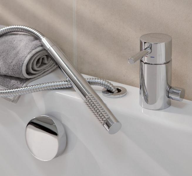 Strømberg Et-grebs armatur med håndbruser. Vandpåfyldning gennem overløb inkl af-overløbssæt  |