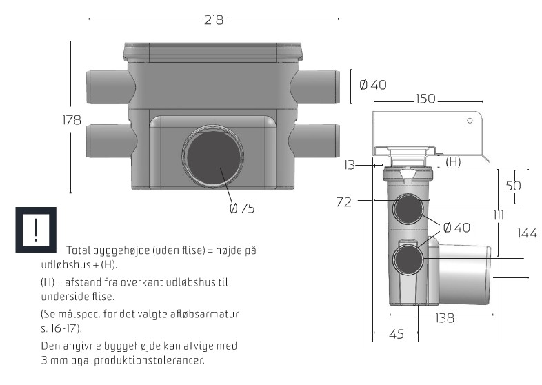 Unidrain udløbshus 75 mm vandret og dobbelt sideudløb m/vandlås