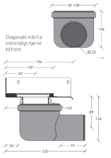 Unidrain 2411 udløbshus med vandret udløb i Ø75 mm med indbygget optagelig og adskilbar vandlås med stor selvrensningseffekt. Kan drejes 360°, hvilket kan lette rørføring Passer til hjørnearmatur 2011.0200